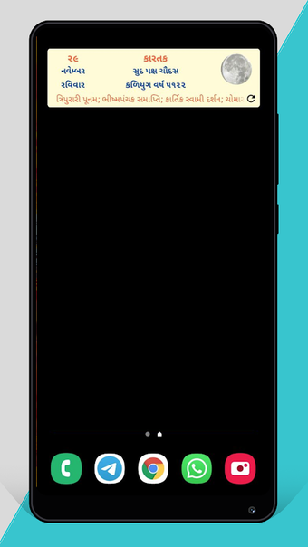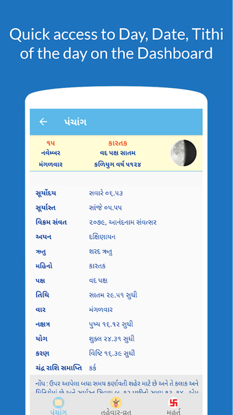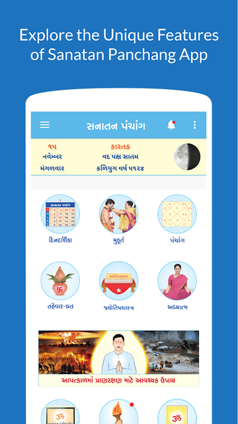 Aplikasi ini memiliki widget di layar beranda. Anda dapat dengan mudah melihat detail kalender Gujarati dan tanggal saat ini. Aplikasi ini juga memiliki catatan singkat dan artikel tentang agama Hindu, ayurveda, dan topik lainnya.